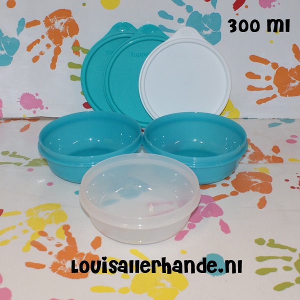 / Tupperware set van 3x ruimte schaaltje 300ml 2x blauw en 1x wit met bling