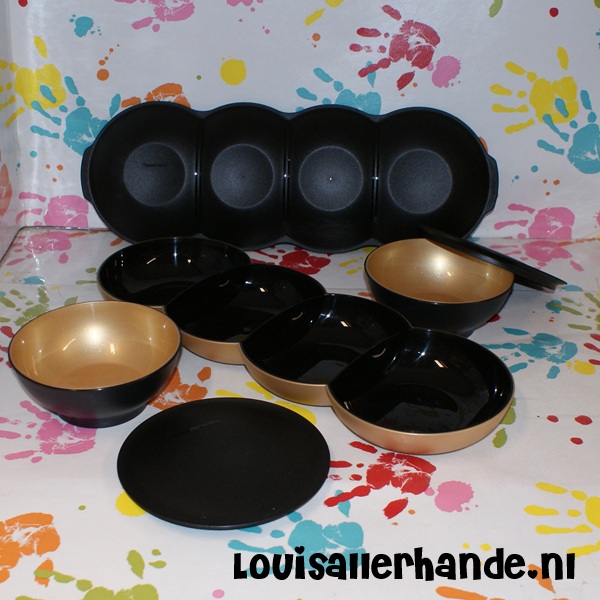 / Tupperware allegra tapasschaal met deksel en 2 schaaltjes 275ml zwart / goud
