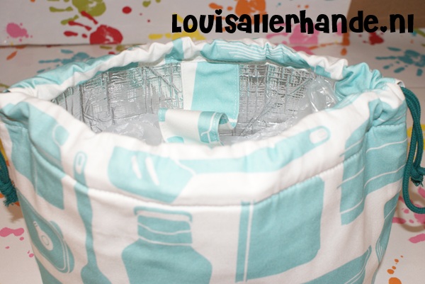 leuke geïsoleerde tas met trekkoord en handvat. afmetingen 24,5×15,5x22cm hoog. veelzijdig te gebruiken als lunchtas, knutseltas enz enz enz. ook te gebruiken als hooi madam.