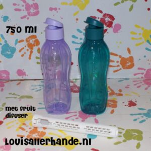 Tupperware set van 2x eco fles plus 750ml petrol en paars met 1 fruit difuser