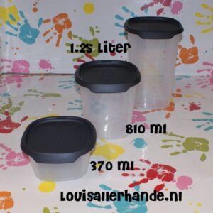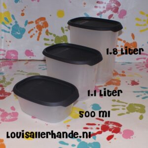 Tupperware set van 3 cubix bussen VK 650ml, 1 Liter en 1,8 Liter met zwarte deksels